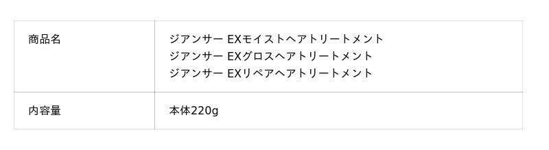 - EXモイストヘアトリートメント:摩擦・紫外線等による日常ダメージに。うるおい、まとまり美髪ブースト