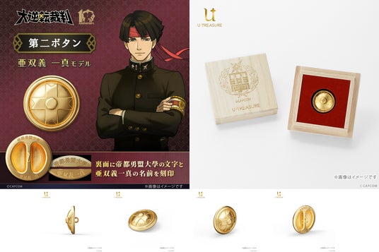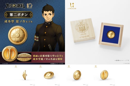 「大逆転裁判」シリーズ10周年を記念して、株式会社ユートレジャーより成歩堂と亜双義が通っていた「帝都勇盟大學」の学生服のボタンがグッズに! 1月7日(水)~2月16日(月)の期間、予約受付を行います。