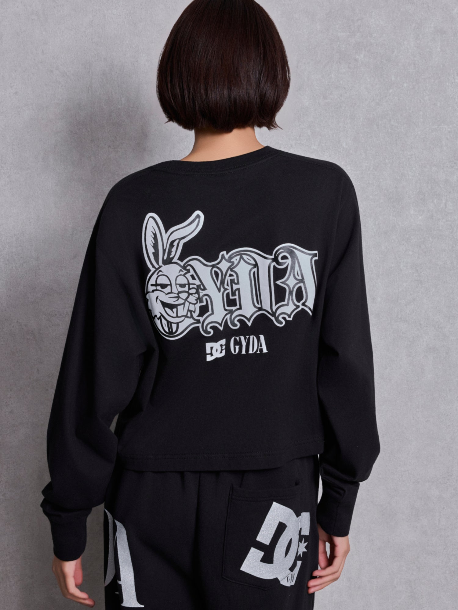 GYDAロゴの”G”とBUNNYをドッキングしたオリジナルアートの発泡プリントが目を惹くロンTや、GYDAとDCロゴのラメグリッター加工がインパクトのあるショートTシャツ、Tシャツとセットアップ着用可能なダメージスウェットパンツの全3型を展開します。