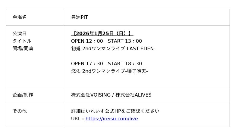 2ndソロアルバムのリリースを記念し、2026年1月25日(日)豊洲PITにて、初兎・悠佑それぞれのソロワンマンライブを開催いたします。本公演では、各アルバムで描かれた世界観やメッセージを、ライブならではの表現で立体的に体感できるステージが予定されています。初兎は神話的モチーフと人間的感情が交錯する世界観を、悠佑はロックサウンドと衝動的な表現を軸に構成されたライブを展開し、それぞれの“現在地”と“覚悟”を鮮明に提示する公演となりますので、是非ご注目ください。