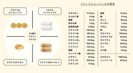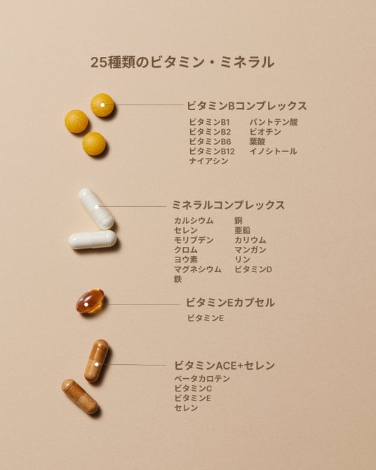 配合成分(全25種): ビタミンB1、ビタミンB2、ビタミンB6、ビタミンB12、ビタミンC、ナイアシン、葉酸、パントテン酸、ビオチン、ビタミンE、ビタミンD、亜鉛、銅、セレン、マンガン、クロム、鉄、カルシウム、マグネシウム、モリブデン、カリウム、リン、ヨウ素、βカロテン、イノシトール