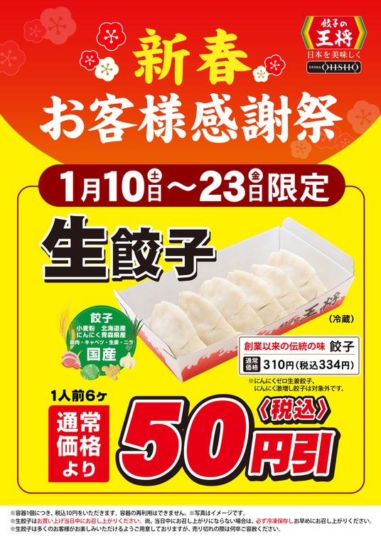 1月10日から23日の期間限定で、お持ち帰りの生餃子を通常税込価格から 50 円引きで販売する