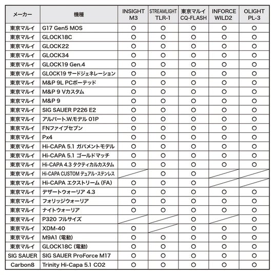 調整ネジ構造により、ハンドガン×ライトの組み合わせに柔軟対応。グロック、ハイキャパ、M&P、SIG系など、多様なハンドガンを安定して保持します。