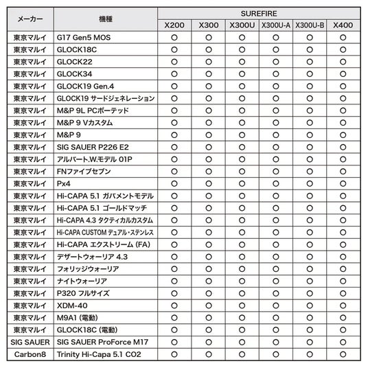 SUREFIRE X300シリーズ、STREAMLIGHT TLR-1、OLIGHT PL-3など、複数メーカーのウェポンライトに対応。ライト形状に合わせて細かく調整でき、装着したまま安全に収納・ドローが可能です。