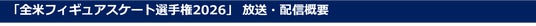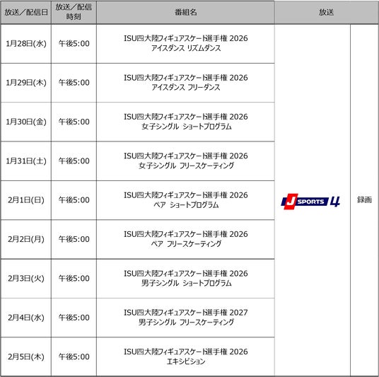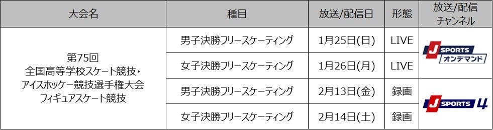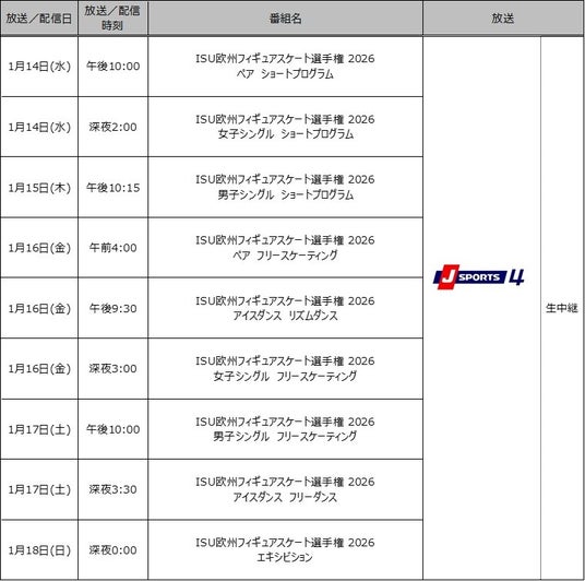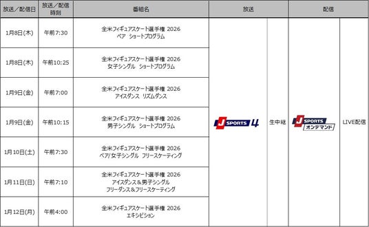 スポーツテレビ局、株式会社ジェイ・スポーツ(本社 東京都江東区、代表取締役社長 長谷 一郎、以下「J SPORTS」 ※1)は、国際大会から国内の学生大会までを圧倒的ボリュームでお届けするフィギュアスケート(2025/2026シーズン)の放送/配信ラインアップを決定しました。国際大会は、2026年1月8日(木)から開催される全米フィギュアスケート選手権(以下「全米選手権」)を皮切りに、ISU(国際フィギュアスケート連盟)主催のISU欧州フィギュアスケート選手権(以下「ISU欧州選手権」)、ISU四大陸フィギュアスケート選手権、ISU世界ジュニアフィギュアスケート選手権、ISU世界フィギュアスケート選手権を全種目放送します。また、PC、スマホ、タブレットで見られる 「J SPORTSオンデマンド 」 ※2 では全米選手権の全種目・全滑走をLIVE配信します。 ※3