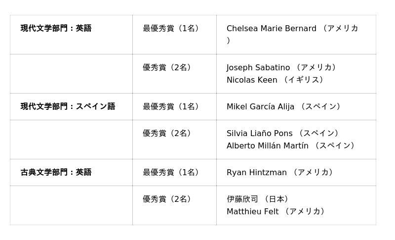 「第10回文化庁翻訳コンクール」の授賞式では、現代文学部門(英語・スペイン語)および古典文学部門(英語)の受賞者のご紹介をいたします。