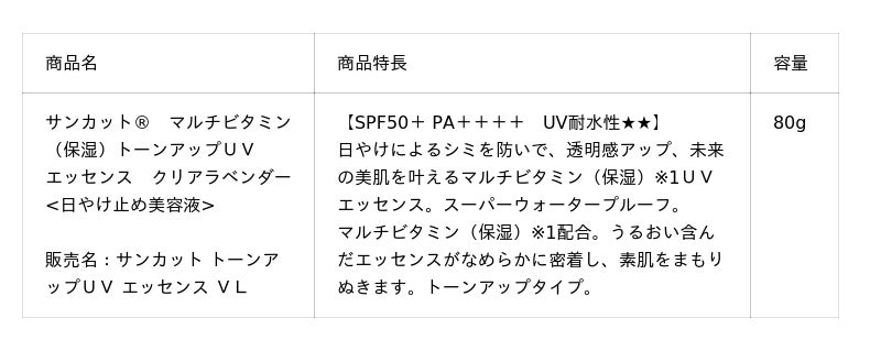 このような背景から、『サンカット(R)』より「マルチビタミン(保湿) トーンアップUV エッセンス クリアラベンダー」を発売いたします。