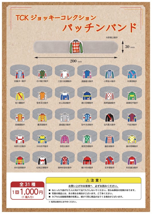 G-FRONT1階ゲームコーナーに設置しているカプセルトイ自動販売機に新商品の「TCKジョッキーコレクション パッチンバンド」が登場しました!1回1000円で全31種類のいずれかが入っています。なお、大好評の「TCKジョッキーコレクション ダイカットステッカーセット」も引き続き販売しております。パッチンバンドもステッカーも、運が良ければジョッキー直筆サイン入りが手に入れられるかも!? ご来場の際はぜひご利用ください。