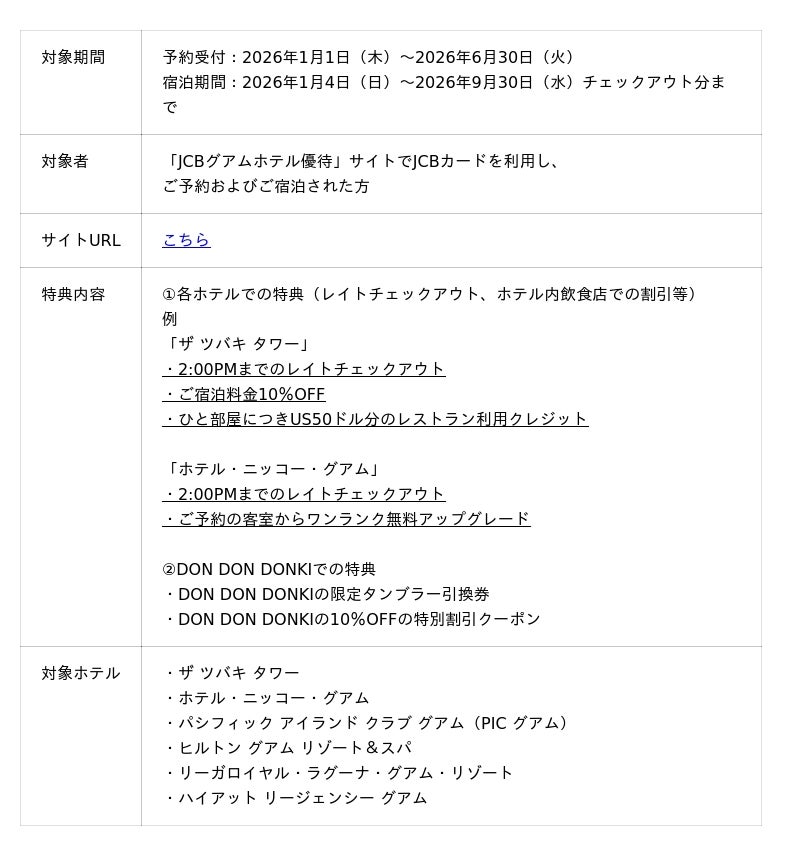 日本発唯一の国際カードブランド運営会社である株式会社ジェーシービーの海外業務を行う子会社、株式会社ジェーシービー・インターナショナル(以下、総称して JCB)は、株式会社ケン・ホテル&リゾートホールディングスと、「DON DON DONKI」を運営するパン・パシフィック・リテールマネジメント(グアム)との特別キャンペーンを2026年6月30日(火)まで実施いたします。期間中、専用ページから対象ホテルを予約して宿泊すると、グアムのDON DON DONKIのオリジナルタンブラーと割引券をプレゼントいたします。