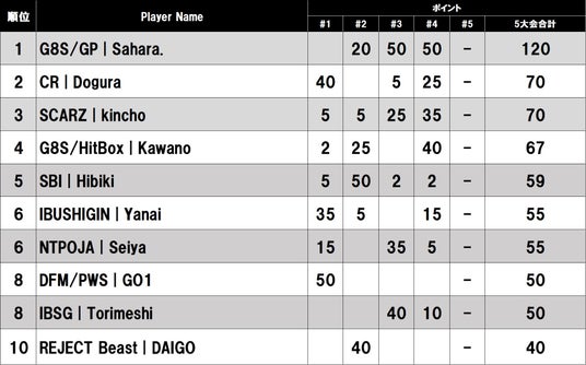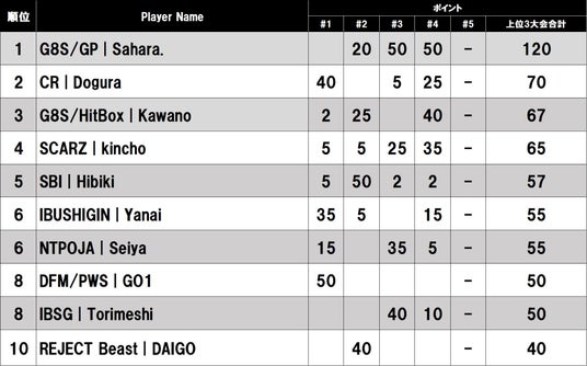 2. 上記の選手を除き、自身が参加した上位3大会分の合計ポイント順位上位8名によって行われる決勝大会の優勝選手。
