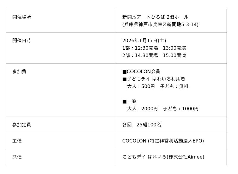 重症心身障がい児のと家族や支援者向けに学び・遊び・情報を提供をする「COCOLON」(運営:特定非営利活動法人EPO、東京都江戸川区、代表:齋藤えりか)は、「0歳からのファミリーコンサート」を1月17日(土)に新開地アートひろば(神戸市兵庫区)で開催します。外出やイベント参加に不安を抱えやすい、重症心身障がい児とその家族。「静かにできなくてもいい」「途中で入退場できる」「医療的ケアがあっても大丈夫」と安心して参加できる音楽体験として、2026年1月17日にコンサートが開催されます。