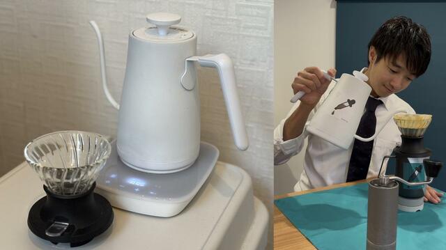 (左)竹田さんも愛用中のケトルとドリッパー (右)淹れている様子 写真=竹田さんご提供