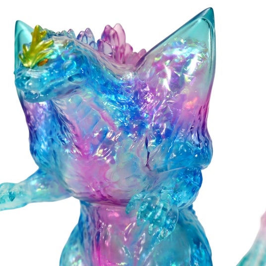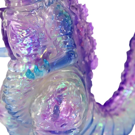 光の反射によって色味が変わるオーロラフィルムを透明度の高いソフビの内部にふんだんに仕込み、体表にクリアパープル・メタリックブルーなどを吹きかけた特殊仕様。