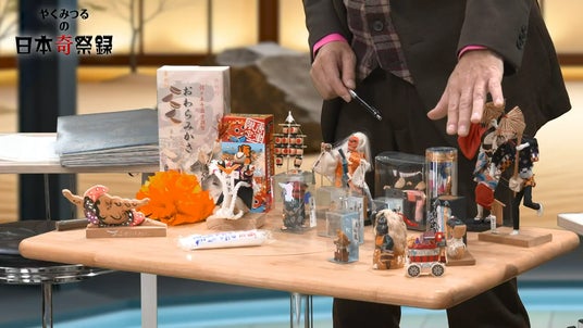 番組でナビゲーターを務めるのは、趣味で全国のお祭りを巡るというやくみつるさん。漫画家、コメンテーター、好角家、珍品コレクター、流行語大賞選考委員などマルチに活躍するやくさんですが、ここ数年で日本各地のお祭りに目覚め、お祭りの珍品蒐集も欠かさず行っているそう。収録でもスタジオに自らのコレクションをお持ちいただく徹底ぶり。