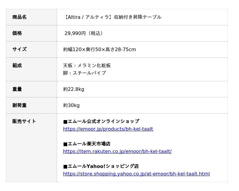 「身体に合った寝る・座る・たたむ」を提供する健康家具ブランドEMOORを展開する株式会社エムール(東京都立川市:代表取締役 高橋 幸司/以下、エムール)は、2026年1月8日より収納付き昇降テーブル『Altira(アルティラ)』の販売を開始しました。