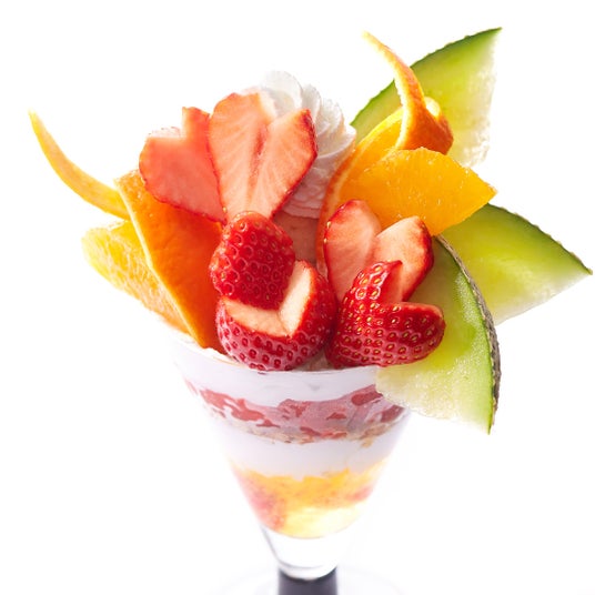 <季節の果実タカノセレクションパフェ~マスクメロン・苺・デコポン(R)~>