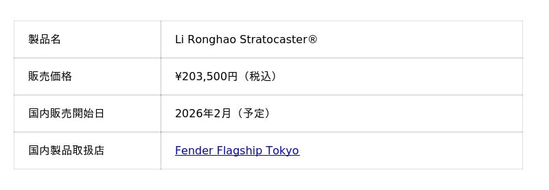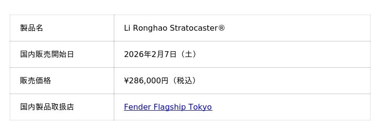 『Li Ronghao Stratocaster(R)』は、中国にてFender China公式オンラインショップおよび正規取扱店で2026年1月7日(水)より販売を開始します。日本では、2026年2月より旗艦店Fender Flagship Tokyoにて販売を予定しています。国内での販売に関する最新情報は、公式サイトでご案内します。