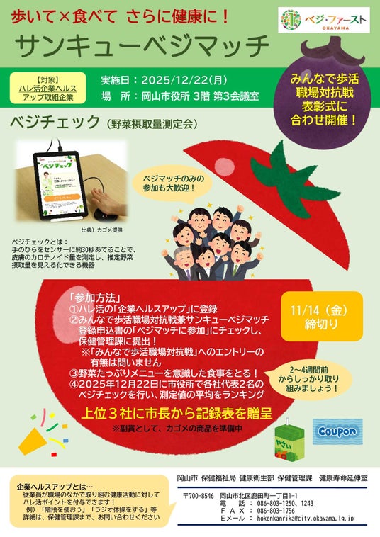 推定野菜摂取量測定会の実施にあたっては、桃太郎のまち推進応援団として、明治安田生命保険相互会社岡山支社様、SOMPOひまわり生命保険株式会社岡山支社様にご協力いただきました。