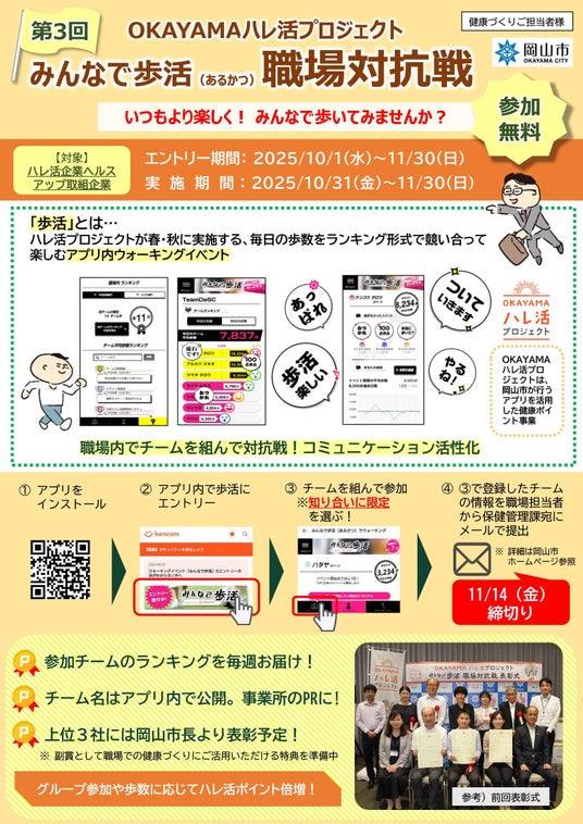 毎日の歩数をランキング形式で1か月間競い合う、OKAYAMAハレ活プロジェクトのアプリ内イベント「みんなで歩活(あるかつ)」。従業員の健康づくりに役立ててもらおうと昨年11月から事業所を対象に職場対抗戦を開始し、今回で3回目の開催。令和7年11月は、19事業所49チーム、381人が参加しました。