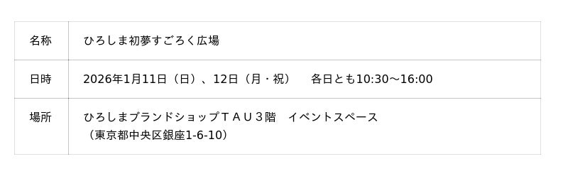 【開催日】2026年1月11日(日)、12日(月・祝)【会場】ひろしまブランドショップTAU3階 イベントスペース