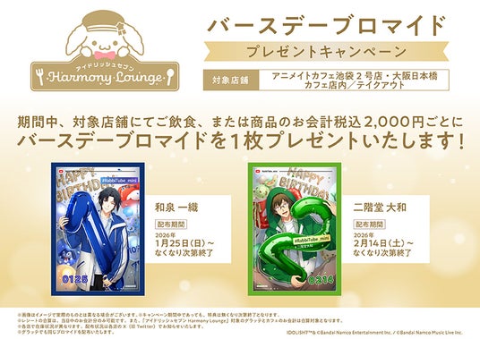 期間中、対象店舗にてご飲食、または商品のお会計2,000円(税込)ごとに、バースデーブロマイドを1枚プレゼント。