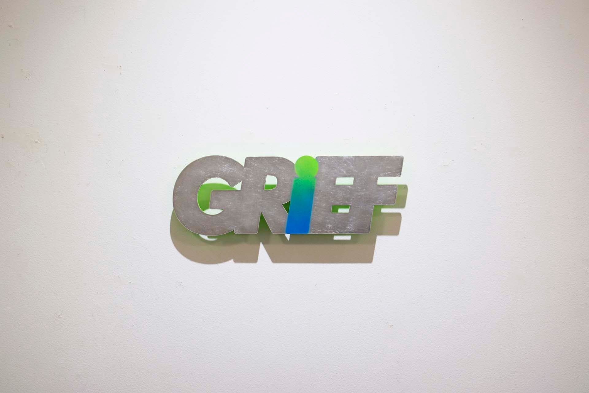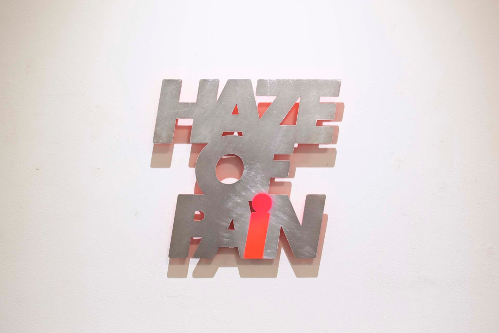 アルミ板から切り出され、曲げ加工で接がれた物質の量感が強いメッセージとなって立ち上がり、言葉は意味以上のものを表現しうることを造形で証明しています。
