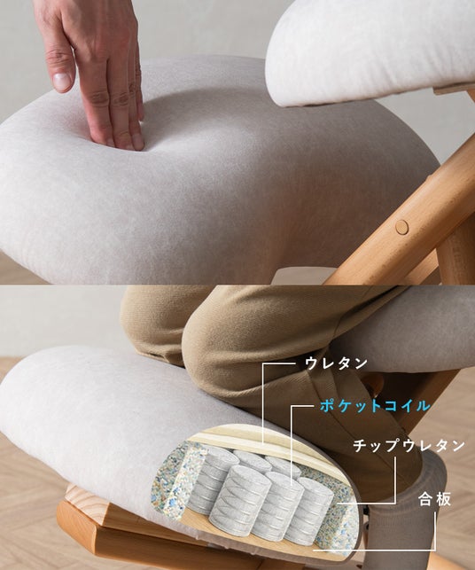 最高級モデルであるSOLAの座面には、新たに低反発ウレタンを採用しました。優れた体圧分散性能により、身体への負担を軽減し長時間使用しやすくなっております。低反発ウレタンの下には程よいクッション性のウレタンと耐久性に優れたチップウレタンを重ねた三層構造です。