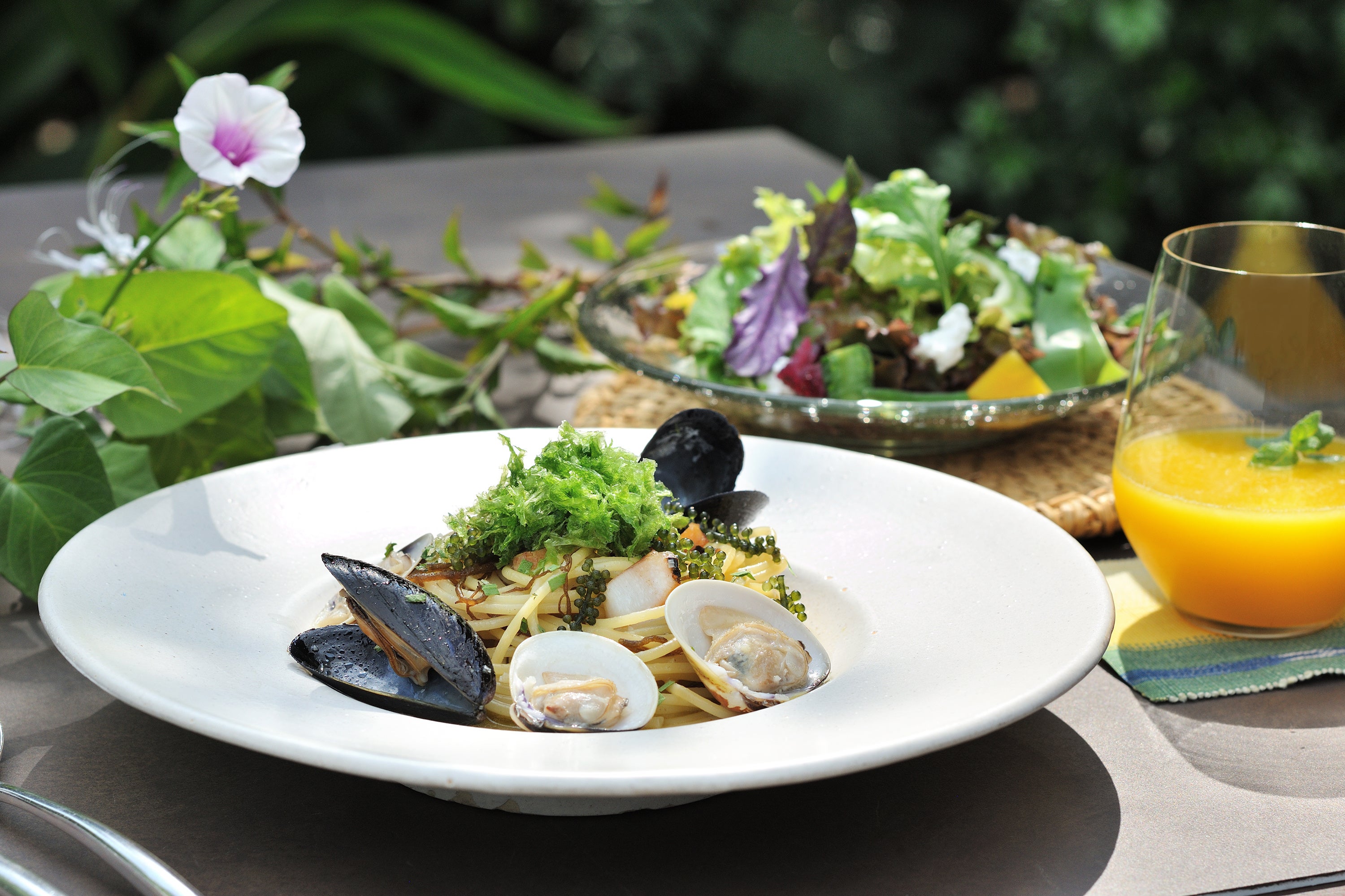アーサーやもずくをはじめとする海の恵みと、この時期に旬を迎えるフーチバー(よもぎ)などの畑の豊かな食材を存分に味わえるランチを提供します。また、ランチの前には、施設内の畑でハーブや野菜を収穫する「畑あそび」も体験。土の香りやハーブの豊かな香りに包まれ、島の畑文化に触れることで心身に活力を満たし、その後のランチで島の豊かな旬の恵みを味わいます。