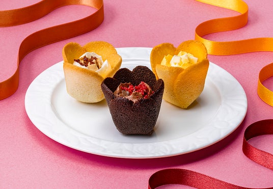 チューリップの花びらのように繊細で軽やかに焼き上げたラングドシャクッキーは、よく見るとハートの花びらを秘めた特別バージョン。香ばしいココアラングドシャと3種の魅力の生食感ショコラバタークリームの本格感のある味わいに、ハートの花びらを添えてバレンタインらしい“ときめき”を加えました。
