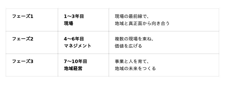 日本各地の地域課題が深刻化する今、求められているのは地域に深く根ざし、共に未来を切り拓く実行型のリーダーです。今回、私たちが用意したのは10年間の『ともに育つ船プログラム』。ふるさと納税支援事業の司令塔として現場経験を積み、マネジメント、そして地域経営へと挑戦する。10年という歳月をかけて、どのような道に進んでも通用する実力を養い、地域の未来を担う人材の育成を目指します。