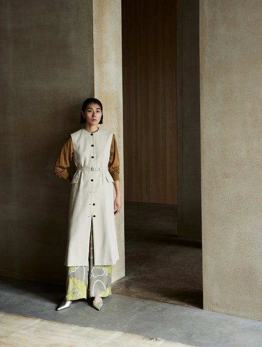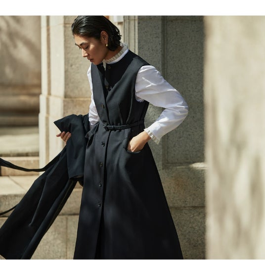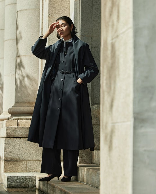Coat / ¥69,300 / TOMORROWLAND collection Dress / ¥69,300 / TOMORROWLAND collection Blouse / ¥26,400 / TOMORROWLAND collection Pants / ¥29,700 / TOMORROWLAND collection
