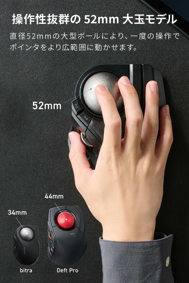 直径52mmの大玉トラックボールを搭載し、本体を動かさず指でボールを回してマウスカーソル(スクリーン上の矢印)を広範囲に動かせますよ。