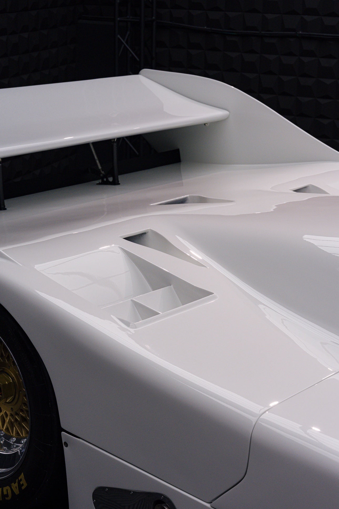 今回フルレストアされ、新たに塗装されたポルシェ962Cに対し、我々はパネルごとのオレンジピール・塗装肌の改善を行いました。完璧な鏡面にするだけではなく、ボディラインを美しく見せるための緻密な肌調整を全面に渡り施しています。 最終研磨は、困難とされるシングルアクションでの水研ぎ工程を部分ごとに実施し、研磨技術のみで陰影を演出しました。そして最終仕上げには、最新作である「IZM COAT」をベースに、この車のために特別調合した「OVER COAT MADLANE」を施工。本当に美しいクルマをさらに美しく磨き上げる――我々のディテイリングの本質とセオリーを体現した一台です。会場ではゆっくりと実物をご覧ください。