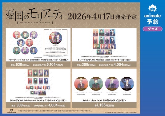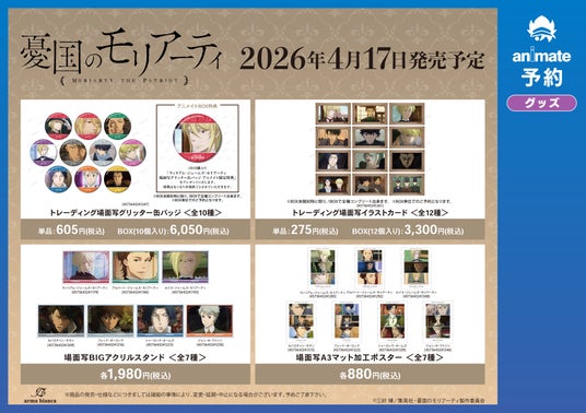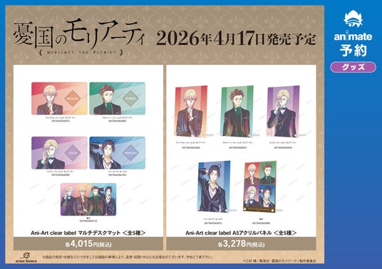 漫画・アニメのオリジナルグッズを販売する株式会社アルマビアンカ(本社:東京都中野区、代表取締役:坂井智成)は、この度、TVアニメ「憂国のモリアーティ」アニメイト先行予約キャンペーンを実施いたします。