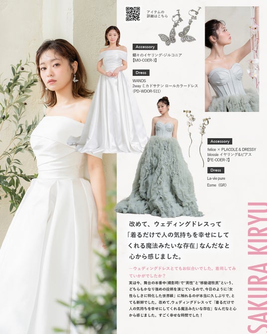 改めまして、吉柳咲良です!今回こうして素敵なドレスを着させていただいて、本当に幸せな気持ちでいっぱいです。ウェディングドレスって着るだけで、不思議と自信が持てるような感覚になれるものだと改めて思いました。きっと、これからたくさんの方がドレスを選ぶ機会があると思います。悩むことも多いと思いますが、きっとその分“素敵な姿”に出会えるはずなので、ぜひたくさんのドレスを楽しんでください。そして、たくさんSNSに投稿してくださいね。私、チェックしに行きます。ウェディングドレスでキラキラと輝く皆さんが、これからもずっと幸せでありますように…!(インタビューより抜粋)