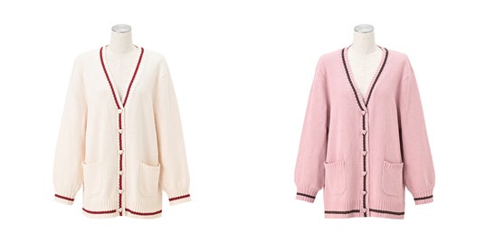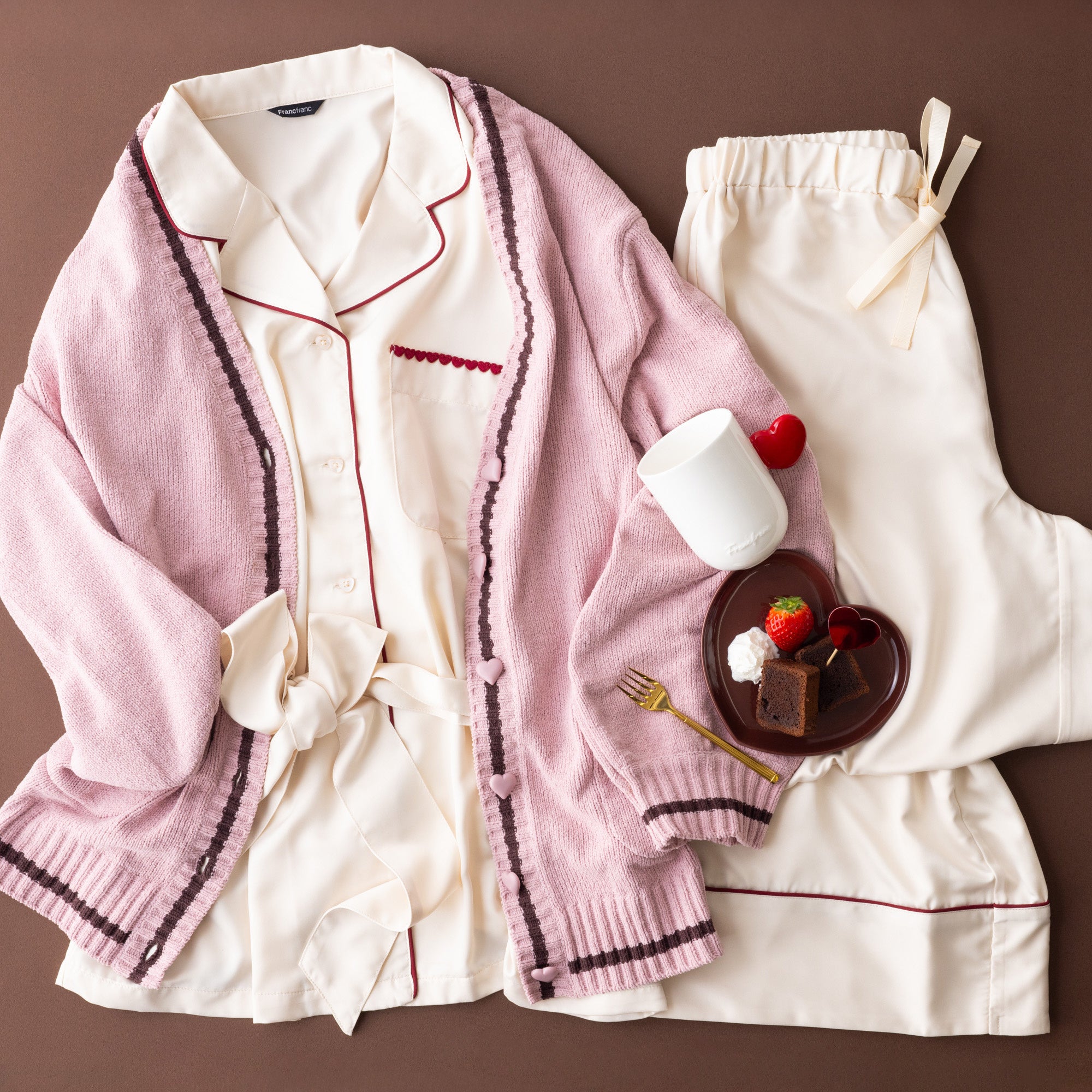 大きめのハート型ボタンがポイントのカーディガンです。柔らかなモールニット素材で、冬から春にかけての温度調節に最適。バレンタインを連想させるカラーリングで、「ヒアルロン酸加工 ハートラインサテンパジャマ」とのコーディネートを楽しめます。