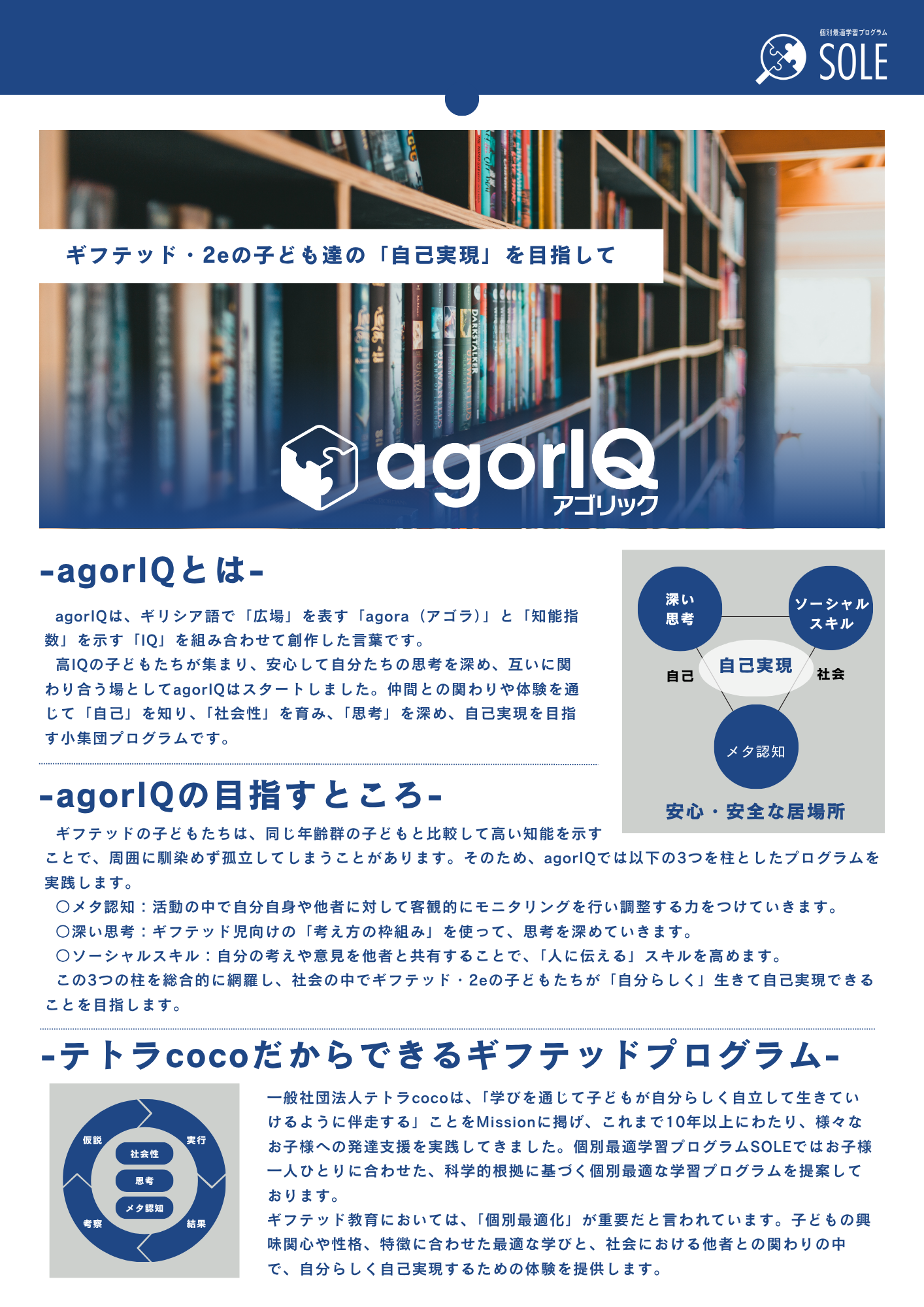 - - 『agorIQ-アゴリック-』及び『個別最適学習プログラムSOLE』を運営する一般社団法人テトラcocoは、「学びを通じて、子どもが自分らしく生きていけるよう伴走する」ことをMissionに掲げ、これまで10年以上にわたり、様々なお子様への発達支援や個別最適な学びを実践してきました。その実践の中で得られた知見をagorIQでも取り入れて、子どもたちの自己実現を実現していきます。