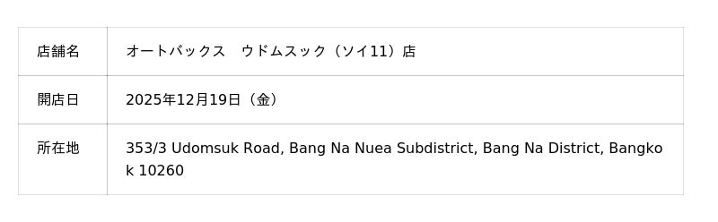 株式会社オートバックスセブン(代表取締役 社長:堀井勇吾)とタイ国内におけるエリアフランチャイズ契約を締結しているSIAM AUTOBACS CO., LTD.(代表取締役:Rangsun Puangprang)は、2025年12月に以下2店舗を新規オープンいたしました。