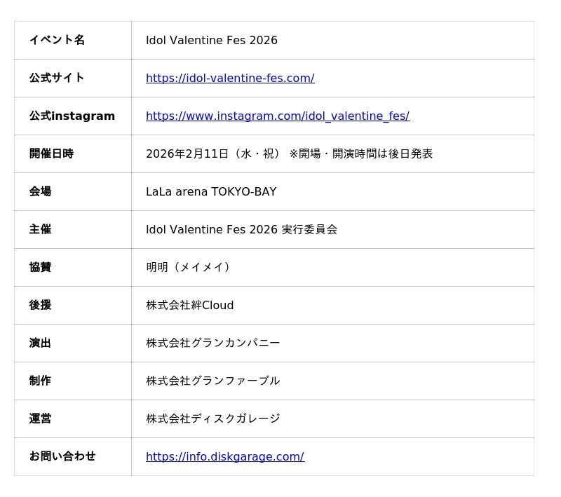 Idol Valentine Fes 2026 実行委員会(運営:株式会社ディスクガレージ)は、2026年2月11日(水・祝)、LaLa arena TOKYO-BAY(千葉県船橋市)にて、『Idol Valentine Fes 2026』を開催します。