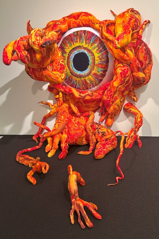 ろう染めの技法を用いた立体作品であり、工芸的な手法を積極的に造形に取り入れている点が魅力となっている。身体のパーツが組み合わされ、あえて整った形ではない、どろりとした生々しさを表現しており興味深い。今回のサイズ制限の中でも、それを感じさせない豊かな造形感覚を作家は備えている。会場内でも特に記憶に残る作品であり、人の心を掴む得体のしれないパワーを放っている。また、その表現には鶴岡政男や靉光らに通じる、戦後美術のスピリットを継承する姿勢も感じられ、高く評価できる。
