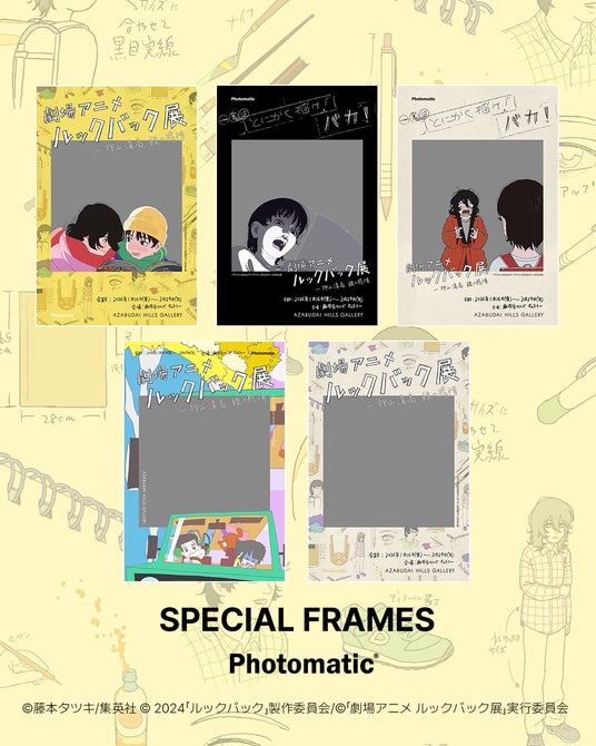 会場に設置されるPhotomaticのフォトブースでは、展覧会のテーマである「線」の魅力を感じられる劇場アニメ『ルックバック』で登場した様々なモチーフをあしらったデザインや、物語の名シーンをフレームに落とし込んだデザインなど、作品の息づかいを感じる全5種のコラボレーションフレームが登場します。