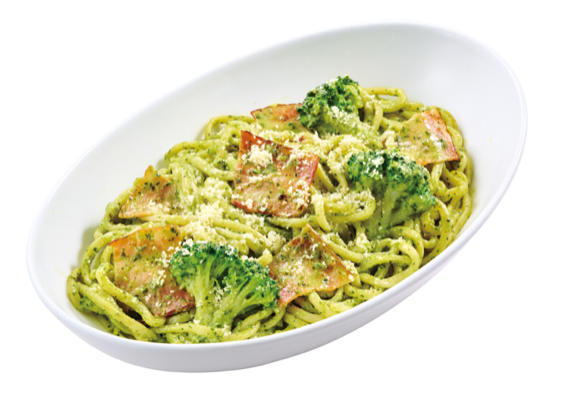 バジル本来の香りが楽しめるオリジナルソースに、コクのあるホワイトソースを加え、クリームパスタにアレンジしました。旨味の詰まったベーコンに、ホワイトソースと相性抜群のブロッコリーやパルメザンチーズをトッピングした、寒い冬にピッタリのクリーム生パスタです。