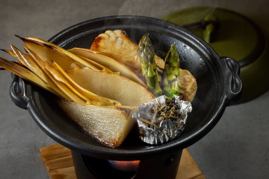 野菜や魚介をふんだんに使ったコースと、春が旬の味覚である皮付き筍の陶板焼きで、季節感のある食事が楽しめます。