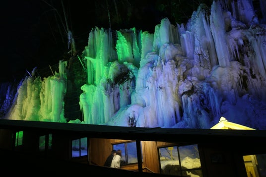 2月の土曜日限定で開催されるライトアップでは、巨大な氷柱が蒼や緑のLEDライトによって照らし出され、闇夜に浮かび上がる姿はまさに幻想的。まるで別世界に迷い込んだかのような、神秘的な空間を創り出します。