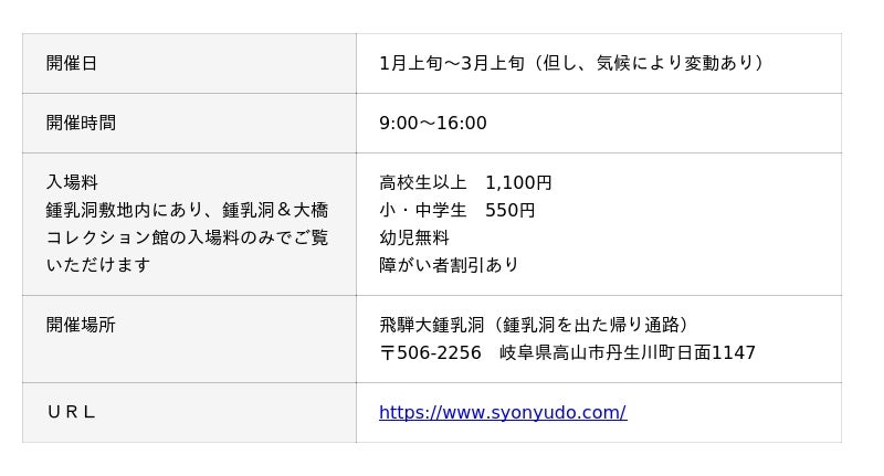 会場となる飛騨大鍾乳洞は、白川郷から車で約70分、高山市街地から車で約30分というアクセスの良さも魅力です。 白川郷、古い町並み散策や温泉旅行と合わせ、冬にしか見られない絶景を体験しにぜひお越しください。