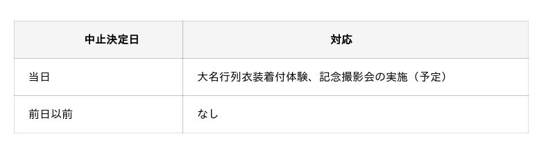 - 姫路お城まつりが中止になった場合や、⾬天時(小⾬含む。)は大名行列の実施を中止する場合があります。中止の場合の対応は下表のとおりです。