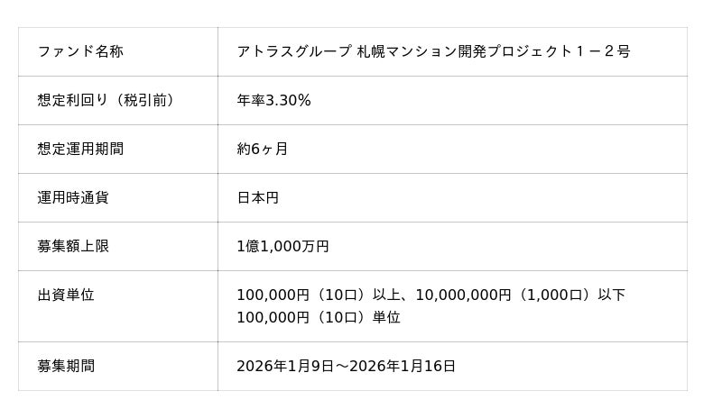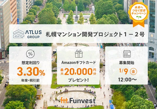 「未来をわかちあう投資」を提供する「Funvest(ファンベスト)」(以下、Funvest)は、「アトラスグループ 札幌マンション開発プロジェクト1-2号」(以下、本ファンド)の募集を1/9より開始しますので、お知らせいたします。