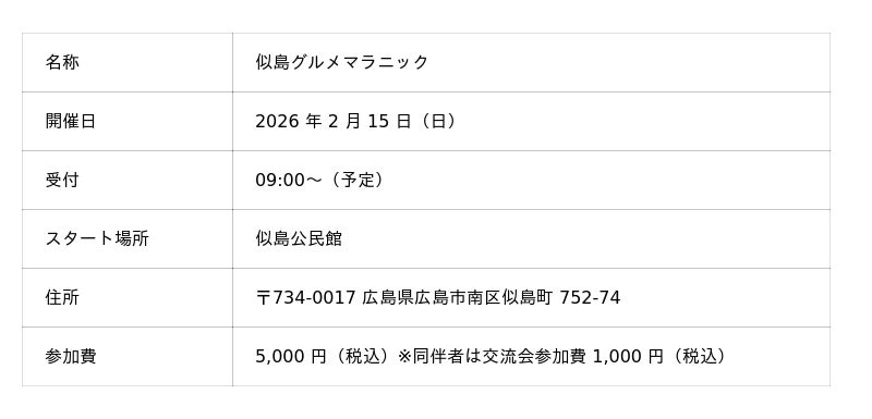 開催の背景「遠出は難しいけれど、非日常を味わいたい」「走るきっかけがほしい」そんな声に応える“気軽な島旅×ラン”の新しい体験として企画しました。アクセスしやすい似島の魅力(自然・景色・食) を、スポーツと交流を通じて楽しんでいただけます。