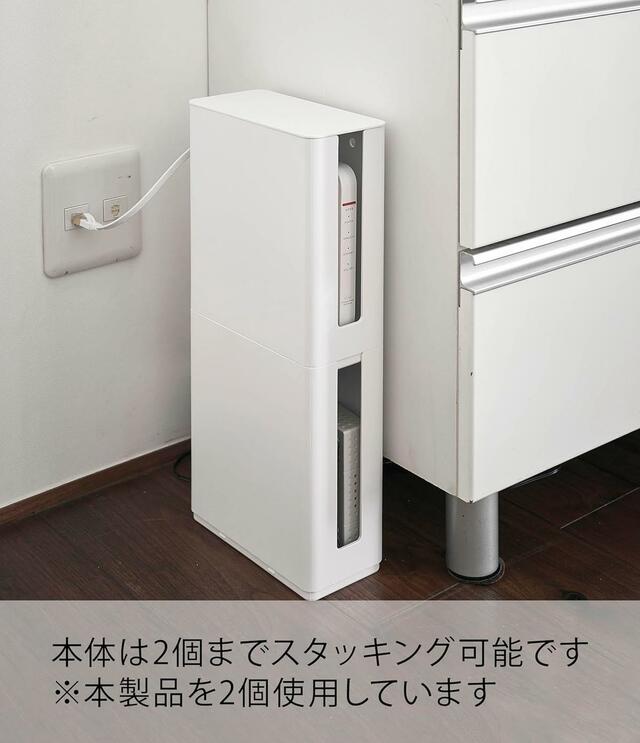 本体は幅約9.7cmのスリム設計ながら、ルーターや電源タップ、外付けHDDなどをまとめて収納可能。蓋付きなので、ホコリを防ぎつつ生活感を隠せるのもうれしいポイントです。リビングに置いても、空間の雰囲気を壊しません。