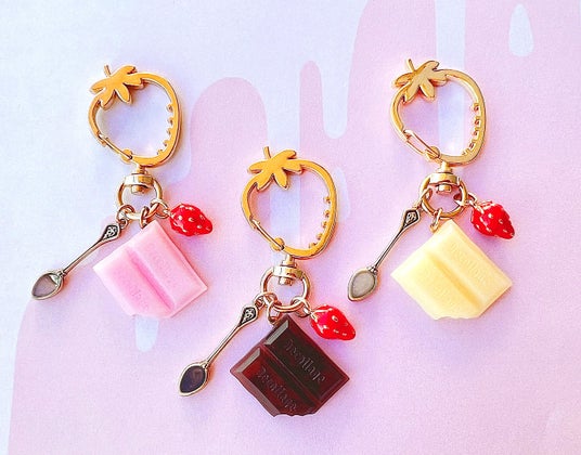 かわいいいちごのチャームが付いたキーホルダーを作りませんか。3色の中からお好みのカラーを選べます。